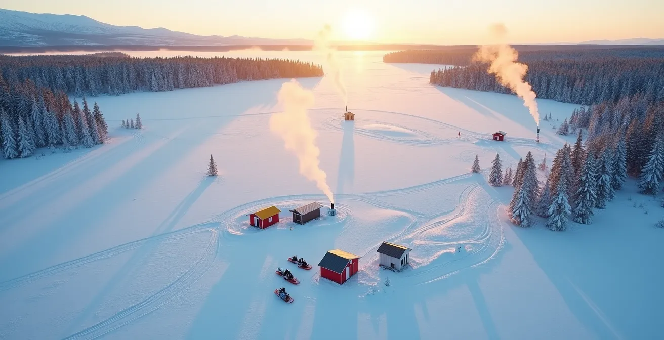 L’ampleur du phénomène est parfois surprenante. Chaque année, sur la rivière Sainte-Anne, plus de 500 cabanes sont installées, créant le plus grand village de pêche sur glace au monde. C’est une véritable petite ville éphémère dédiée à la pêche au poulamon. Mais l’esprit est le même partout, que ce soit dans un grand village ou avec une cabane isolée. Pour Mario Larose, un habitué de la baie Clément en Outaouais, c’est un rituel immuable : « On vient ici passer le temps et avoir du fun ». Il attend patiemment que la glace atteigne 35 cm d’épaisseur pour y installer son « salon », transportant tout son matériel sur des traîneaux.